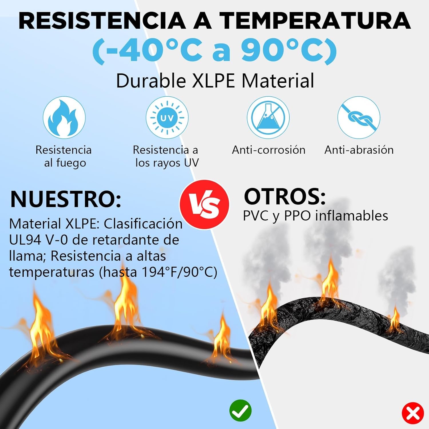 La cubierta interior de XLPE y el revestimiento exterior de XLPO proporcionan una protección térmica, mecánica y eléctrica superior. Soporta temperaturas desde -40 °C hasta +90 °C, lo que lo hace ideal para climas extremos y exposición directa al sol.